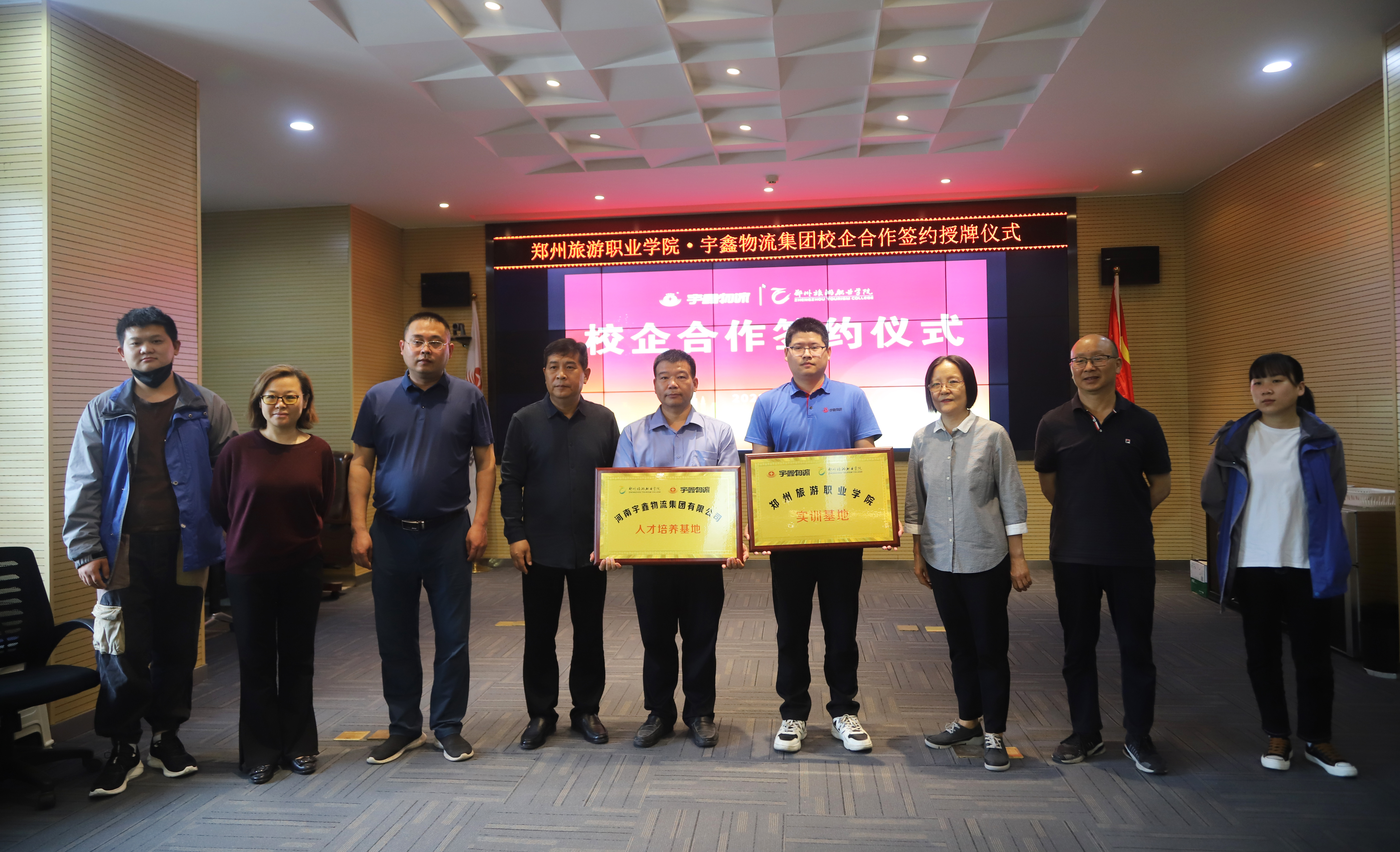 洽谈会后,国际工商学院院长孙权与宇鑫学院常务副院长王遂昌代表双方单位签署并互换合作协议;副校长徐永清代表学校授予宇鑫物流集团“pp电子游戏平台网站实训基地”牌匾,宇鑫物流集团党总支部书记兼副董事长王琳授予pp电子“河南宇鑫物流集团有限公司人才培养基地”牌匾。