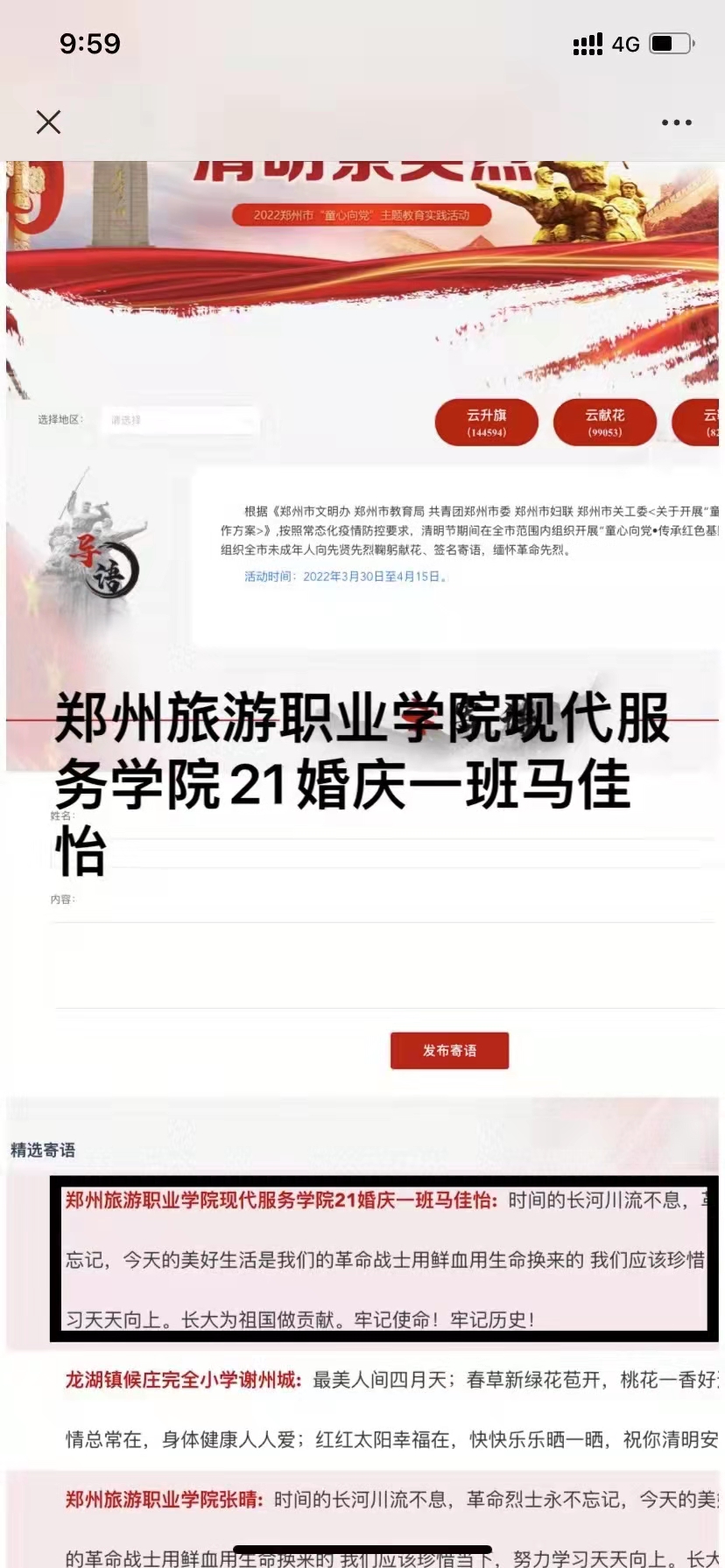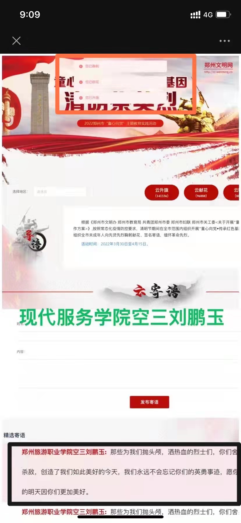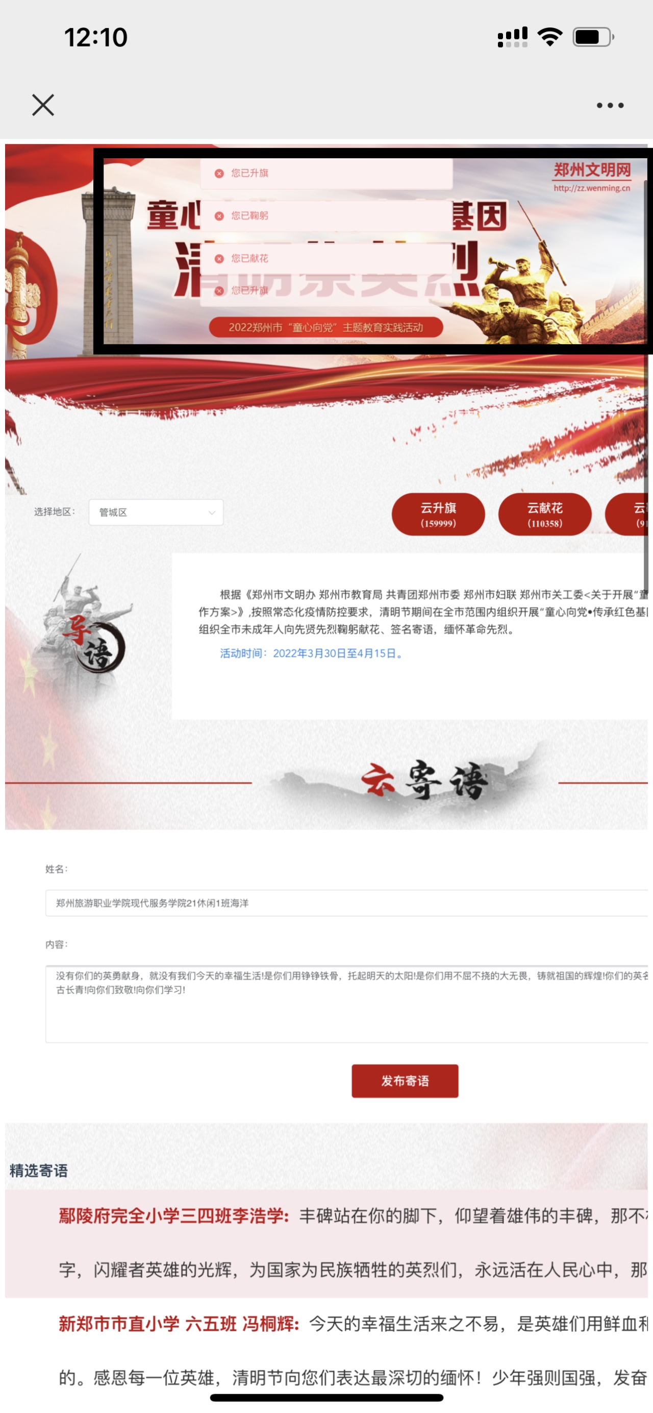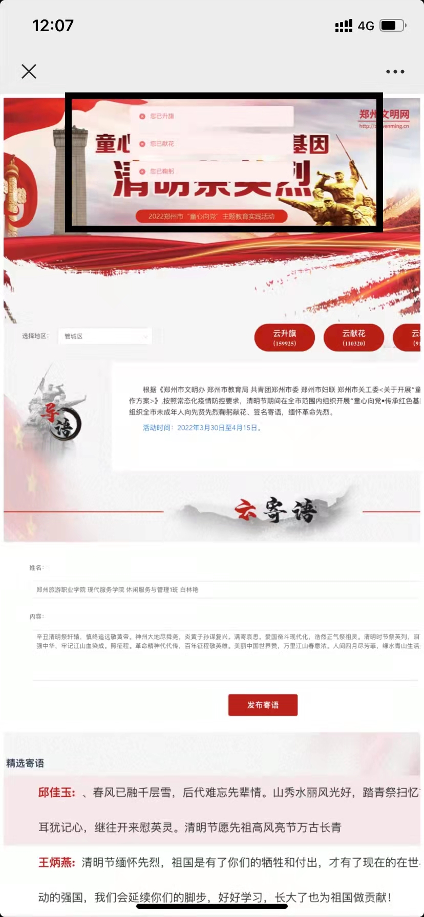 同学们积极参与网上祭拜并签名寄语留言,向先贤先烈鞠躬献花,撰写感言体会,缅怀革命先烈,传承红色基因,立志为实现伟大梦想而努力学习、健康成长。