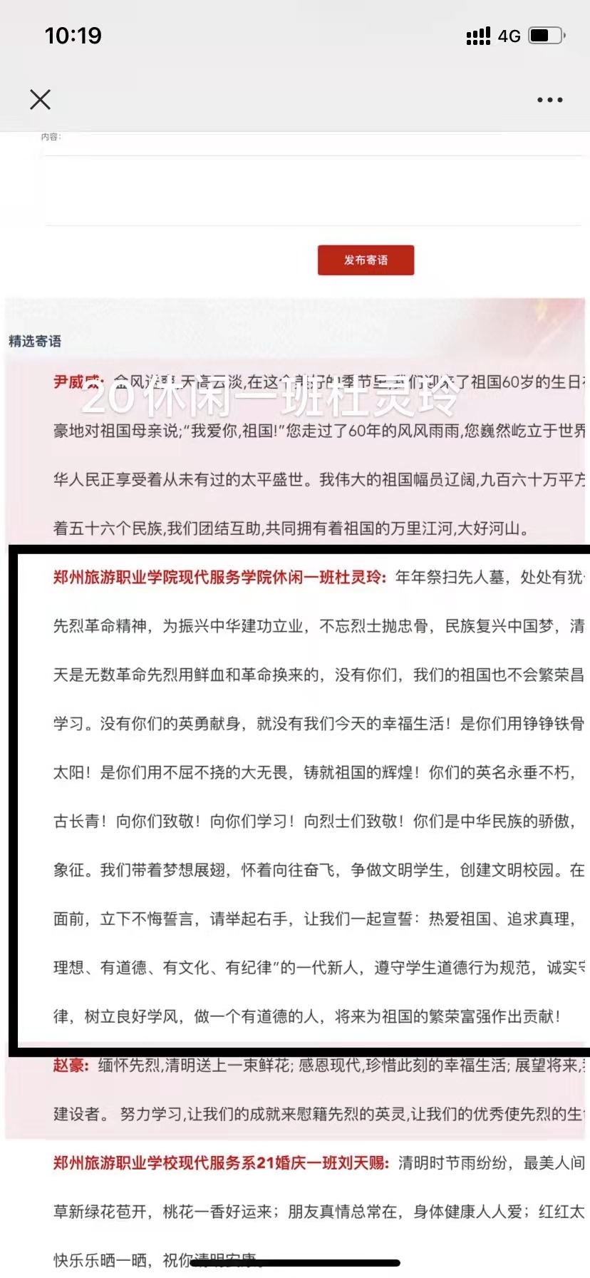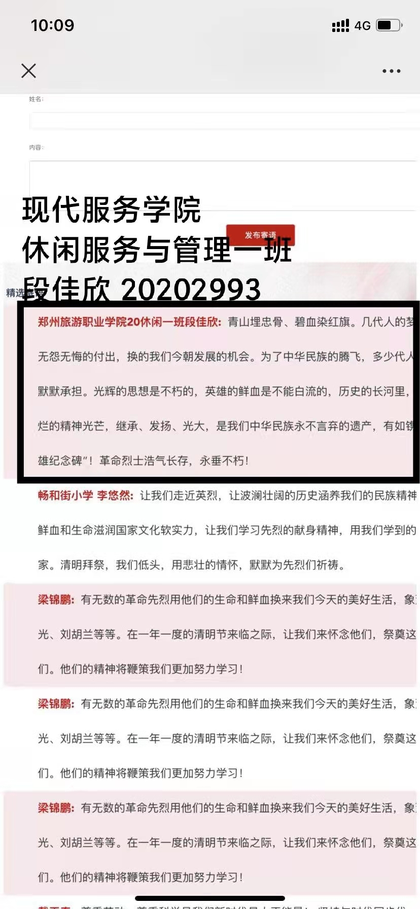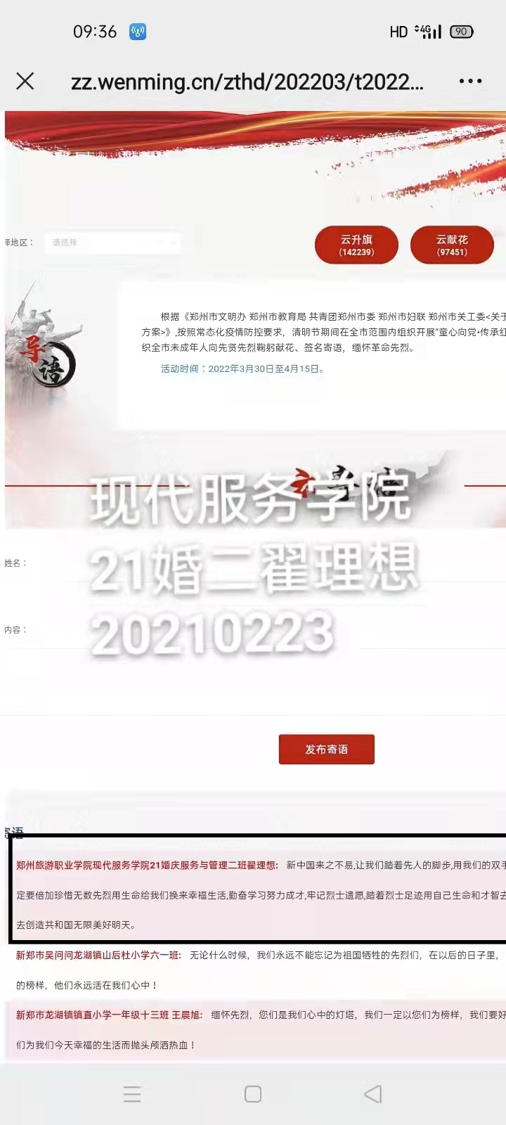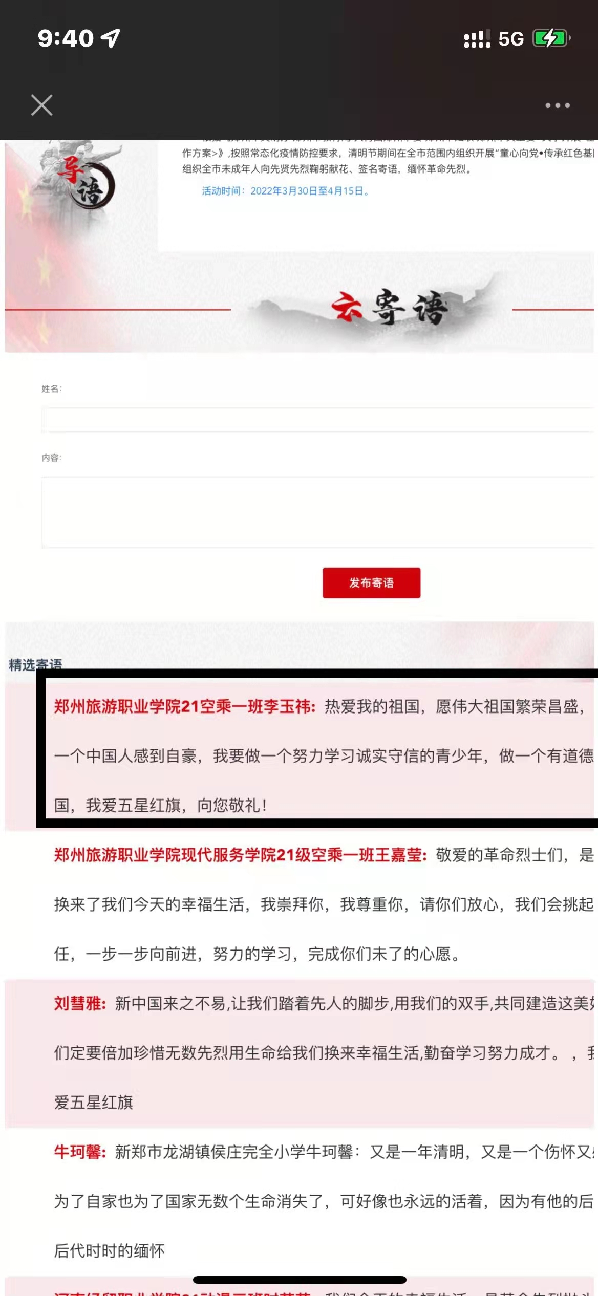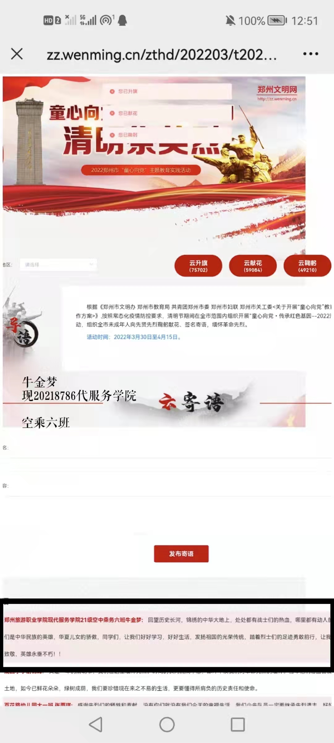 同学们积极参与网上祭拜并签名寄语留言,向先贤先烈鞠躬献花,撰写感言体会,缅怀革命先烈,传承红色基因,立志为实现伟大梦想而努力学习、健康成长。