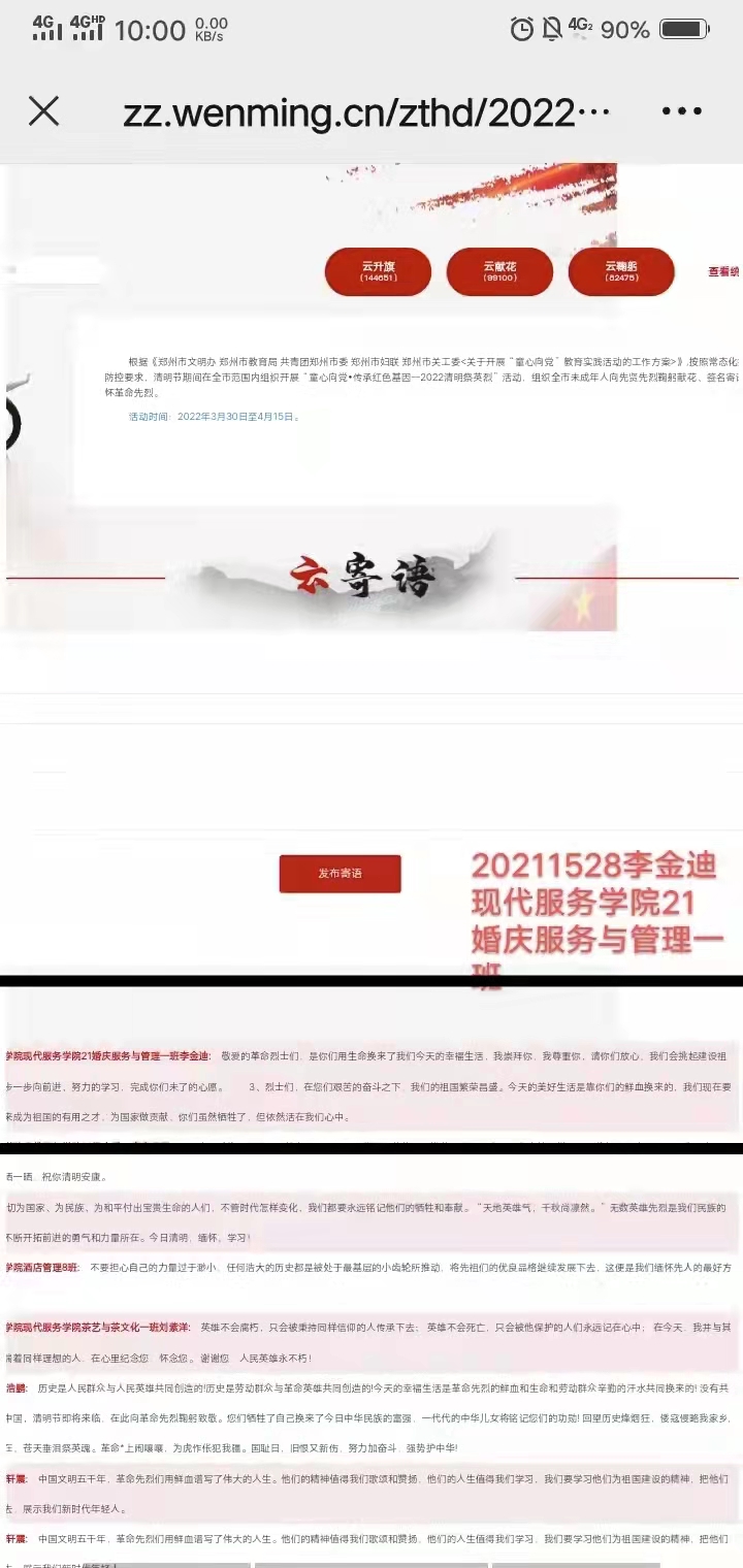 清明节将至,慎终追远,缅先辈英魂,4月2日,现代服务学院组织开展“童心向党•传承红色基因--2022清明祭英烈”网上活动,组织学生向先贤先烈鞠躬献花、签名寄语,缅怀革命先烈。