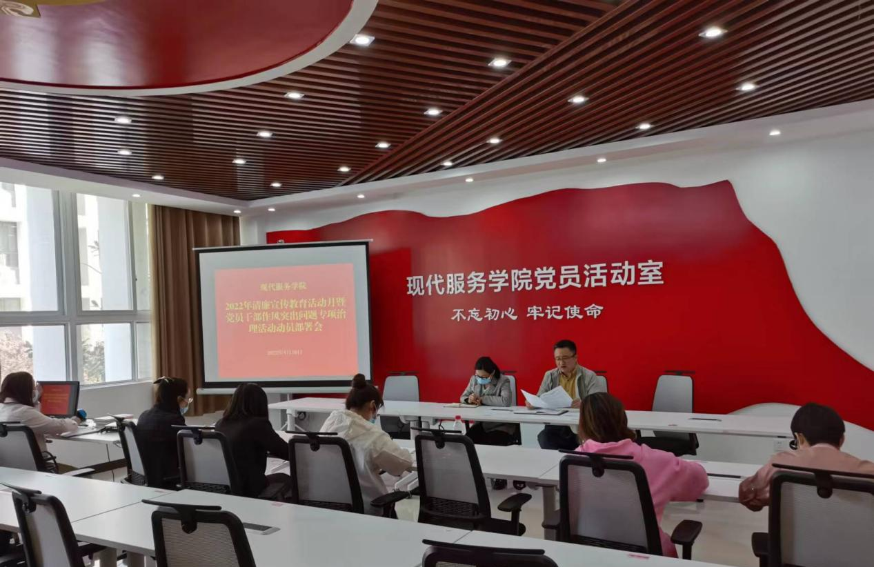 4月20日中午,现代服务学院在1A208党员活动室召开2022年清廉宣传教育活动月暨党员干部作风突出问题专项治理活动动员部署动员会。学院党总支领导班子出席会议,全体副科级以上干部参加,会议由党总支书记郭防主持。