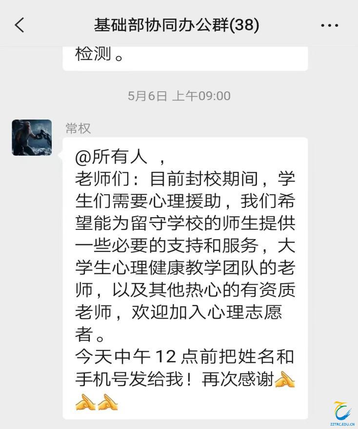 在得知这一消息后,基础教学部主任王小红在第一时间组织本部门教师成立基础教学部心理咨询团队,协助学生处心理咨询中心共同开展心理援助。本部门常权老师、李卫老师、周轶老师、马玲老师、王真老师等第一时间申请报名加入其中。目前,团队中老师们已和学生处心理咨询中心张爱梅老师进行对接并接受了相关的专业培训,听从安排,随时待命。他们克服重重困难,在保证完成正常教学任务的同时,利用课余时间接听心理援助热线,帮助学生缓解疫情带来的心理压力和焦虑,筑起坚固的“心理长城”,为学生保驾护航贡献自己的一份力量。