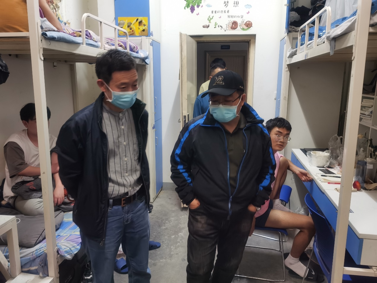 5月7日晚,烹饪食品学院党总支书记胡志霞、院长李晓东深入宿舍探望学生,中餐教研室主任王风雷、宿舍管理老师张家豪、辅导员花磊一同前往。