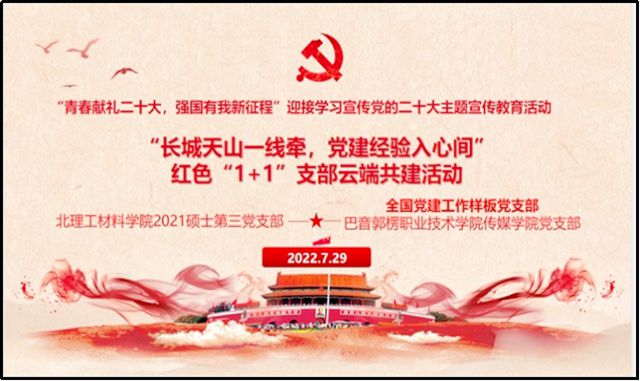 为庆祝建党101周年,喜迎党的二十大胜利召开,进一步强化党建引领,促进校际党建合作交流。2022年7月29日上午,北理工beat365官方网站联合新疆巴音郭楞职业技术学院开展“长城天山一线牵,党建经验入心间”红色“1+1”支部云端共建活动。北理工beat365官方网站党委书记、院长金海波,巴音郭楞职业技术学院党委委员、副院长王红,巴音郭楞职业技术学院传媒学院党支部书记孟轩羽全程参加指导共建。北理工beat365官方网站2021级硕...